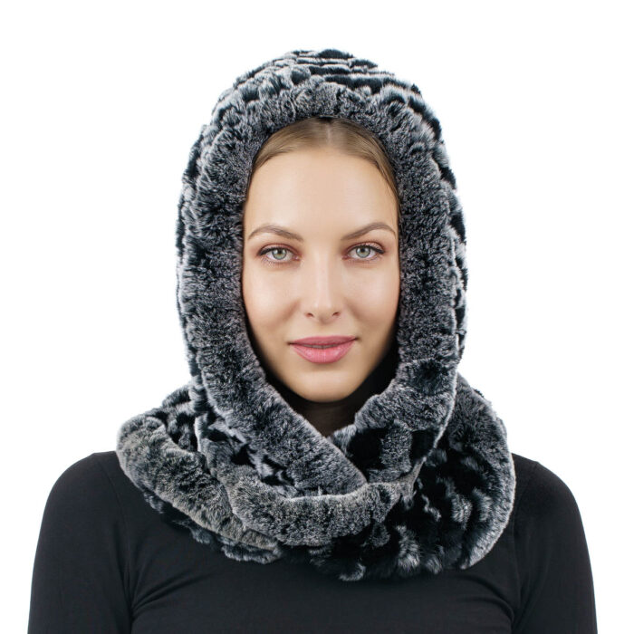 Ανακαλύψτε την απόλυτη αίσθηση ζεστασιάς και κομψότητας με την πολυτελή κουκούλα με ενσωματωμένο κασκόλ από αυθεντική γούνα Rex.